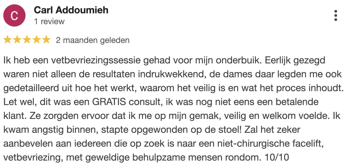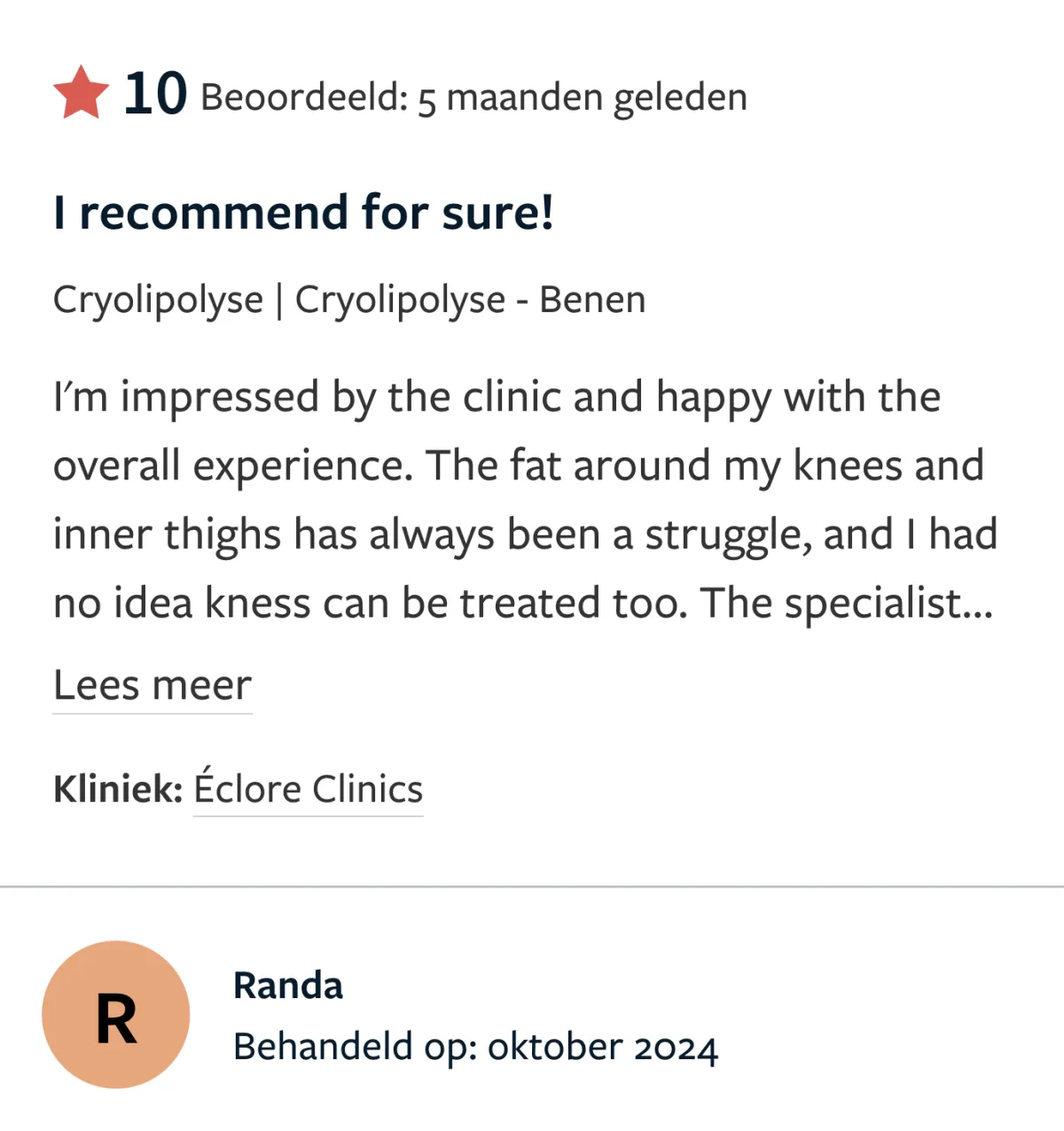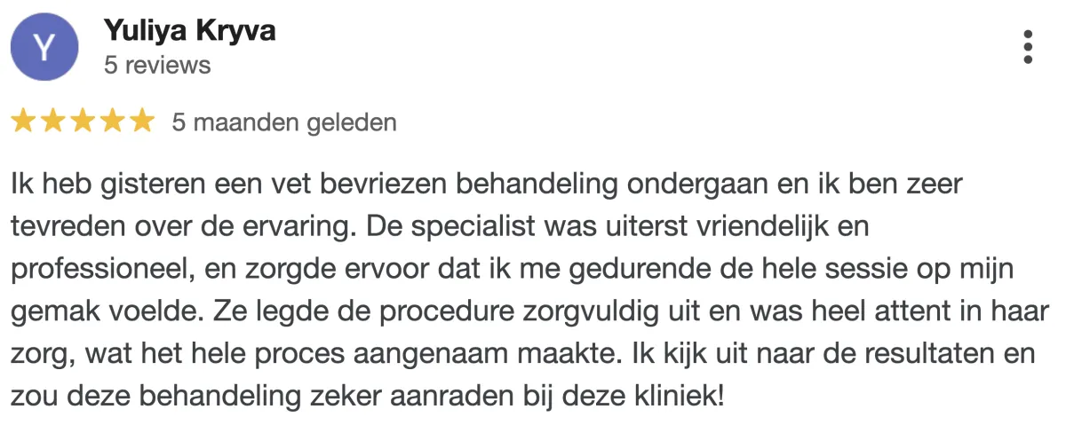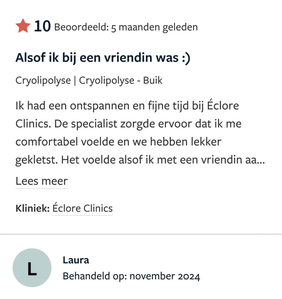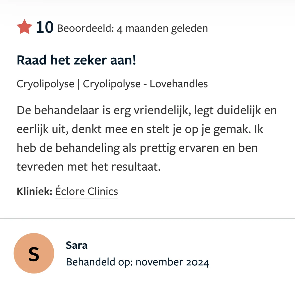 Cryolipolyse: Veel klanten zijn al tevreden na één sessie. Soms is een tweede sessie nodig bij extra volume.